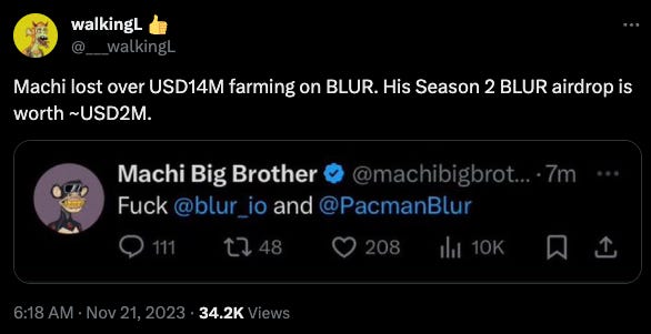 On one extreme end you have people like MachiBigBrother who received around $2,000,000 worth of BLUR in the airdrop, but lost around $14m in the process of farming. He is not happy.
