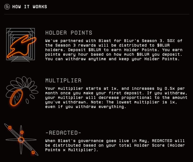Important note: all of the below are ways to farm for [REDACTED($BLAST)] or Blast “airdrop points” — there is no mention of any more $BLUR tokens being airdropped for the time being.