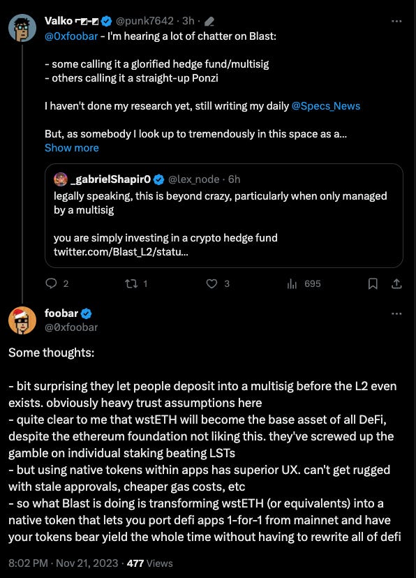 Anyway, Blast is a business, they want more users and TVL, and they are exceptionally talented at knowing how to play the game to make that happen. That’s what makes me want to not-bet-against-them and not-middle-curve this whole airdrop/points situation.