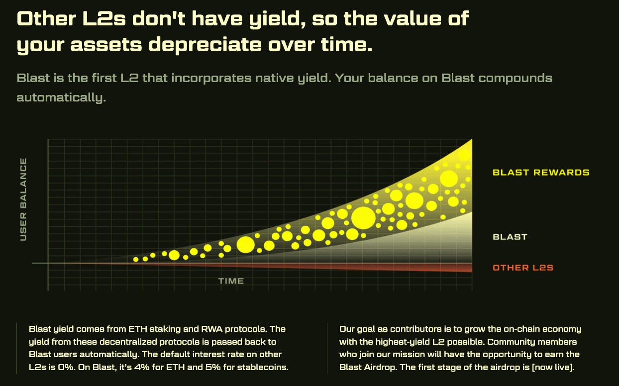 The situation at the moment is that anyone can stake ETH, or stake their stable coins, but doing so will require an action (and gas fee) to stake, and then another to unstake. It’s impractical to have all of your funds staked. Blast is claiming to be building in such a way that all funds on the chain automatically earn yield.