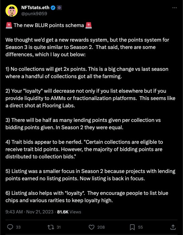 The other half of s3 rewards will go to people using the Blur protocol, similar to how s2 went, with a few notable changes.
