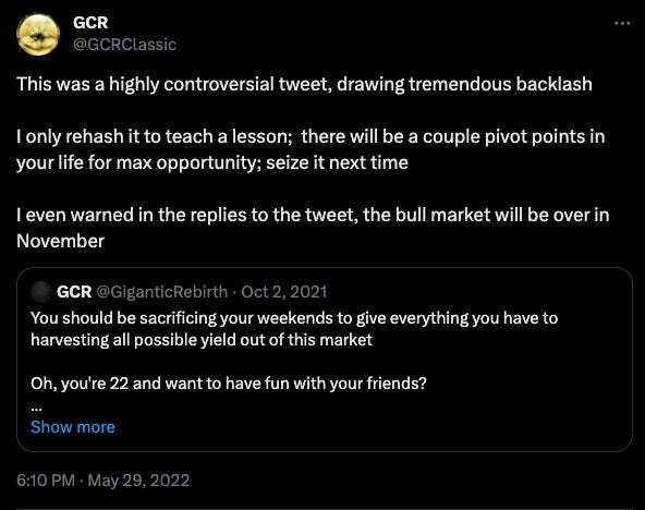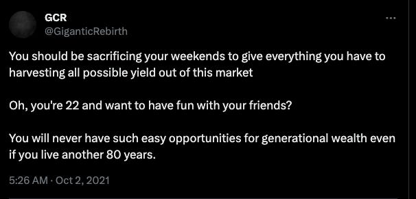 I’m getting a lot more active. I’m gonna be writing a lot more here. I’m gonna be sharing everything I can with my community in ZenAcademy. I’m gonna be trying to embrace my inner degen, the one that was a professional gambler for 15 years, the one that is a gamer at heart, that is competitive, strategic, loves solving problems, and wants to win. It’s not for everyone. Most people are better of DCAing into a few ‘safe’ assets and forgetting about it. But for the crazy and chaotic and insane few of us out there, this is the time to put our heads down and hustle.