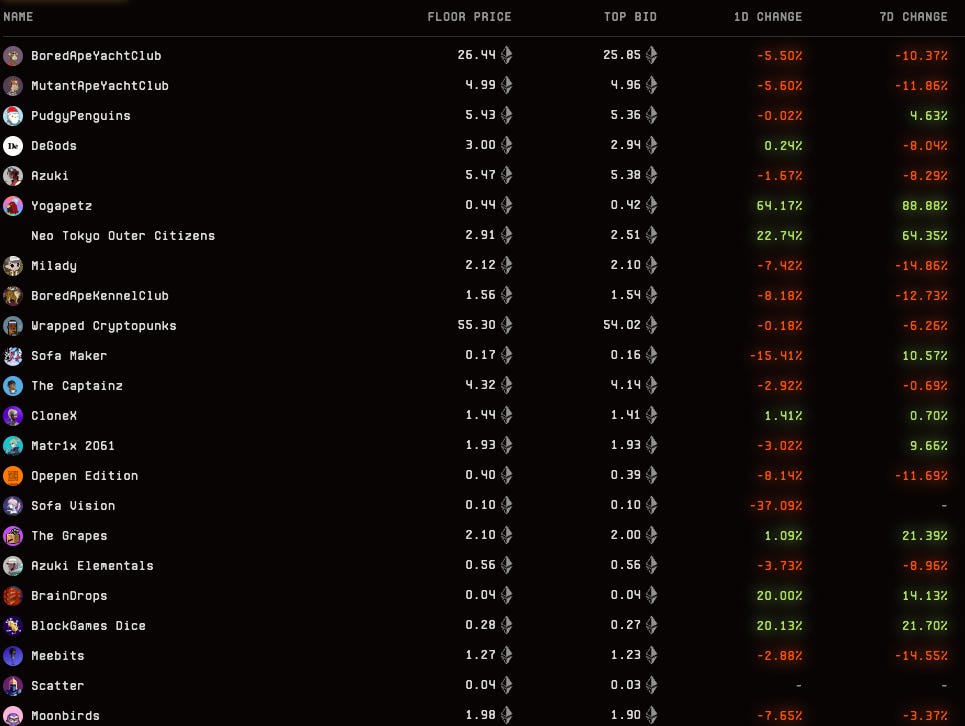 Anyway, the impact on the market is a pretty bloody day (made even more bloody by the Binance/CZ news). Hard to know if it’s going to keep bleeding from here or we see a bottom and turnaround, but my plan for many weeks has been to sell out of a lot of collections I have low conviction on and rotate into higher-conviction plays, and that’s very much still the plan. Sucks that prices are down, but we must stay the course.