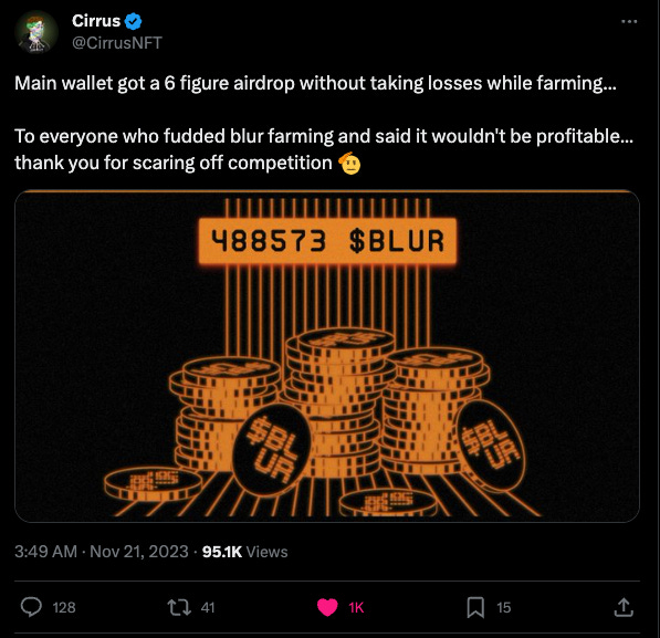 On the other end of the spectrum, you have intelligent traders/farmers like Cirrus who managed to make money while farming and received a 6 figure airdrop (approx $150k).