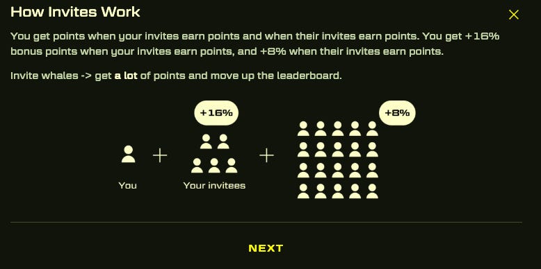 Anyway, back to the points. You need an invite code to sign up, and, here’s the kicker, every time someone signs up via an invite code, they will generate points for the person whose link they signed up via. By the way if you’re enjoying this totally and 100% free newsletter and want to support me and be part of the zen squad, here’s my invite code/link wink wink nudge nudge: https://blast.io/JG04F