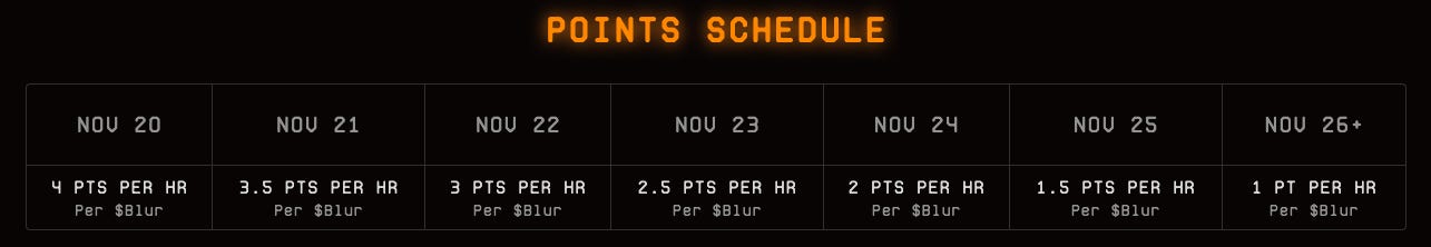 There are high incentives to stake today, earning 4x points per $BLUR (per hour). This number scales down to 1x point per $BLUR from Nov 26th onwards.