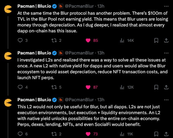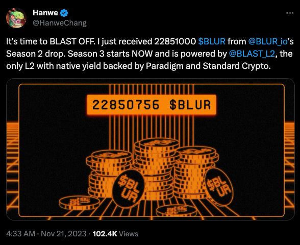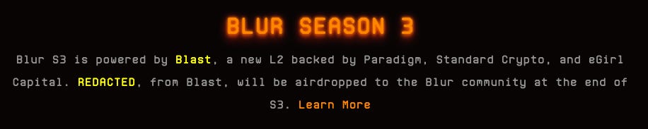 Okay so Blast is a new L2 that’s being built, with the idea being to move a lot of NFT trading there, give native yield to the funds on the chain, and to ideally develop many other dapps and use cases. Seems cool. How does this factor into Blur and Season 3?