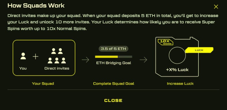 As your squad bridges more ETH, you unlock squad rewards - so far these seem to be more invite codes, and the ability to flip the “luck” cards to increase your Spin outcomes.