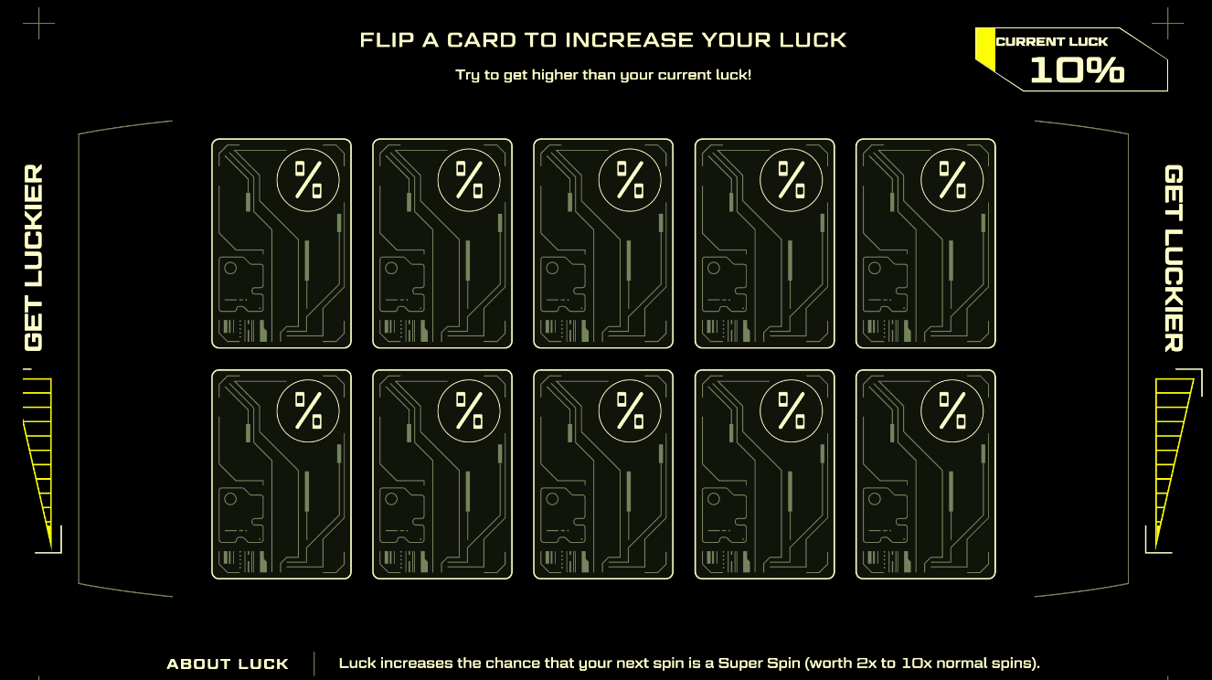 Basically, you flip a card to increase the chance your next spin is a “super spin”, which would give you 2-10x the points of a normal spin. It’s worth mentioning that your luck doesn’t “run out”, it’s permanent for your account until you get a better/higher luck card.