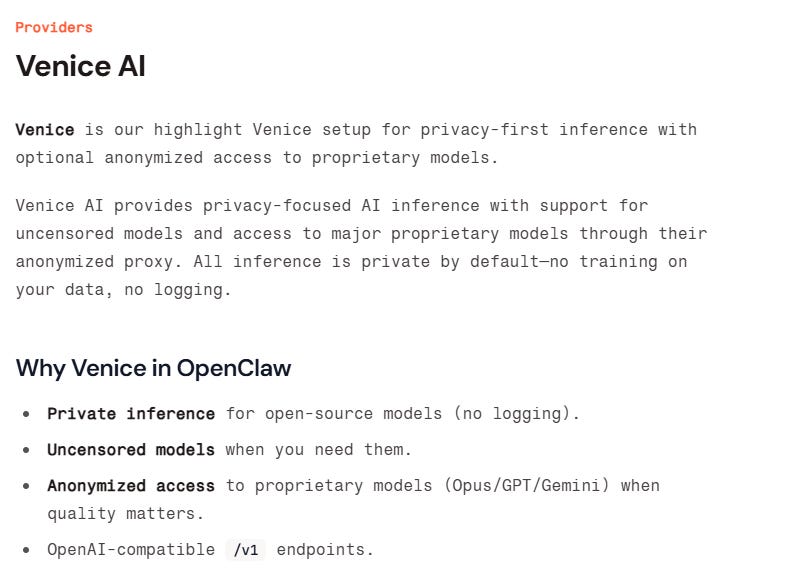 In fact, Venice AI is even highlighted and recommended in the official OpenClaw docs. This is in spite of the fact that the founder OpenClaw is staunchly anti-crypto.