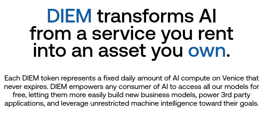 In August 2025, Venice introduced DIEM. This is where the tokenomics get genuinely exciting.