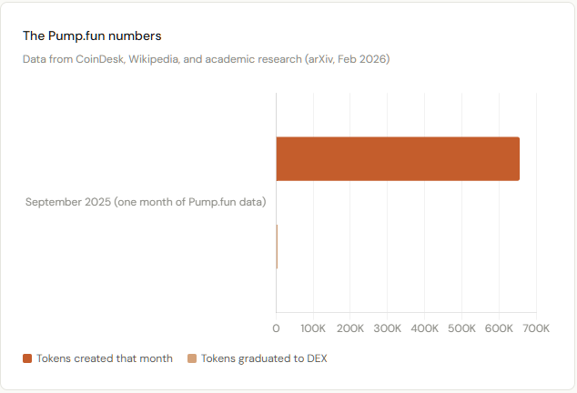 A research paper published in February 2026 studied one month of Pump.fun activity. During September 2025, 655,770 tokens were created by 243,123 distinct wallet addresses. Of those, only 4,338 graduated to a DEX. That’s a 0.63% graduation rate.
