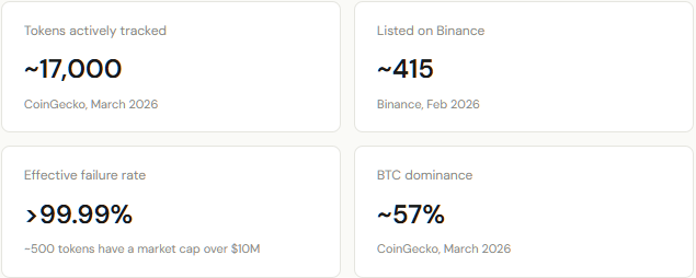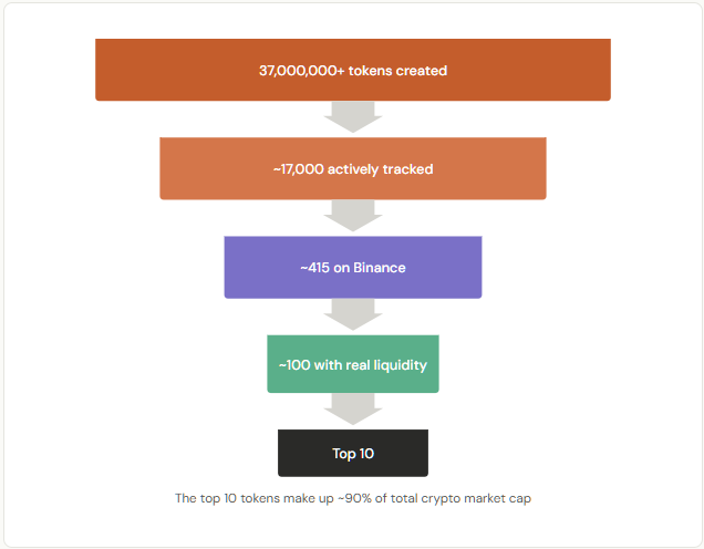CoinGecko tracks about 17,000 tokens. Binance lists 415. The gap between “exists” and “has meaningful liquidity” is enormous.