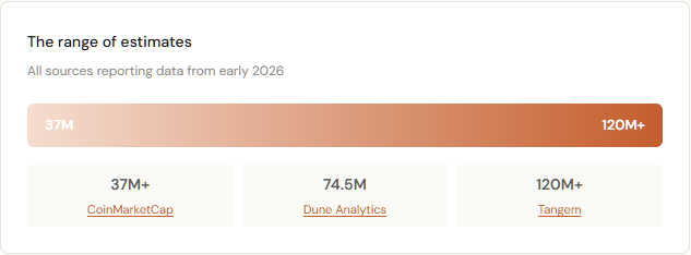 CoinMarketCap counts tokens they’ve indexed across all chains and reports 37 million+. Dune Analytics, tracking unique tokens across all major chains, shows about 74.5 million. Tangem cited on-chain data in January 2026 showing over 120 million tokens across all major networks.