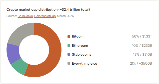 Bitcoin takes ~56 cents of every dollar in crypto. Add Ethereum and stablecoins and you’re at 79%. The top 10 tokens account for close to 90% of the total marketcap. That leaves roughly $230 billion to be spread across tens of millions of other tokens.