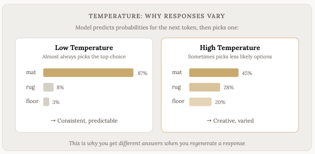 This is also why the same prompt sometimes gives you different answers. There’s a degree of randomness (called “temperature”) built into the selection process. The model doesn’t always pick the single most likely next token. Sometimes it picks the second or third most likely option, which sends the response in a slightly different direction.