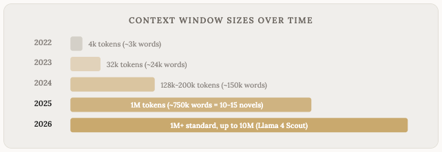 If a model has a 200,000 token context window, that’s roughly 150,000 words it is able to hold in mind at one time. Some models now go even higher. Claude Opus 4.6, Claude Sonnet 4.6, and Gemini all support 1 million token context windows. That’s about 750,000 words, or roughly 10 to 15 full novels. Llama 4 Scout from Meta supports a whopping 10 million token context. These are staggering numbers compared to where things were a few years ago.