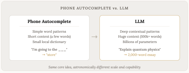Your phone’s autocomplete predicts the next word based on simple patterns. LLMs do the same thing, but with astronomically more data, vastly more computing power, and a much deeper understanding of context.