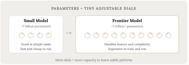 A model with more parameters has more dials to tune, which means it has the capacity to learn more subtle and complex patterns. A small model might learn that “the cat sat on the mat” is a common pattern. A large model learns that too, but it also learns that the sentiment of a paragraph shifts when you use the word “however,” or that a question phrased politely tends to expect a different kind of answer than a blunt one. The larger the model, the more of these subtle relationships it picks up.