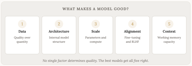 Training data quality. More data isn’t always better. Cleaner, higher-quality data leads to better models. If you train on a lot of garbage, the model produces garbage.