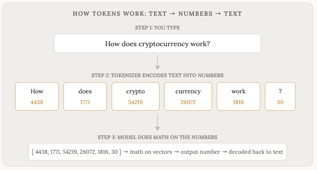 When you type a message, the first thing that happens is your text gets encoded into tokens, where each token is assigned a number. The word “hello” might become token 15339. The word “the” might be token 1820. The word “cryptocurrency” might get split into two tokens: “crypto” (54219) and “currency” (26072).