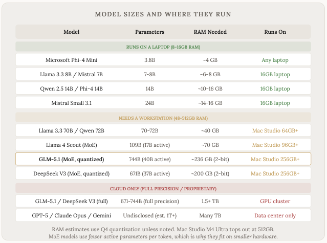 There’s also a technique called Mixture of Experts (MoE) where a model has a huge total parameter count but only activates a fraction of them for each token. DeepSeek V3 has 671 billion total parameters but only uses 37 billion per token. GLM-5.1 has 744 billion total but only 40 billion active. This lets big models run on smaller hardware than you’d expect.