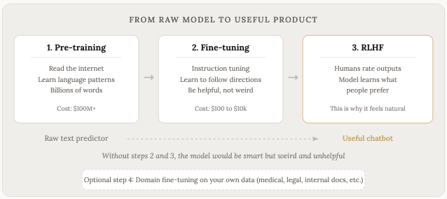 Fine tuning is what turns a base model into something useful. It’s a second round of training, done on a much smaller and more carefully curated dataset. This is where the model learns to follow instructions, answer questions, have conversations, and generally behave the way you’d expect a chatbot to behave.