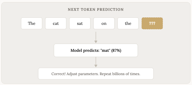 The core learning of “training” process is surprisingly simple in concept. You take a sentence, hide the last word, and ask the model to predict what comes next.