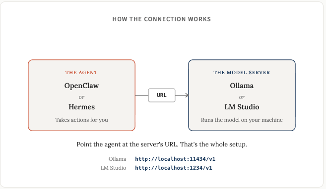 Hermes Agent: Install Hermes, then run hermes model to open the setup wizard. Choose “Custom endpoint”, enter your local URL (same as above: Ollama is http://localhost:11434/v1, LM Studio is http://localhost:1234/v1), and pick the model you’ve loaded. Switch models later with /model in chat.