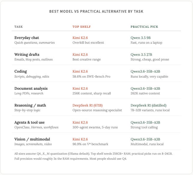 This section literally went out of date twice while I was writing this letter. What follows is my take as of April 21, 2026. Half of this will probably be superseded in three months, if not sooner. Kimi K2.6 literally came out hours ago and I haven’t had a chance to try it myself yet, but I have used GLM-5.1 and it was probably the best choice before Kimi K2.6.