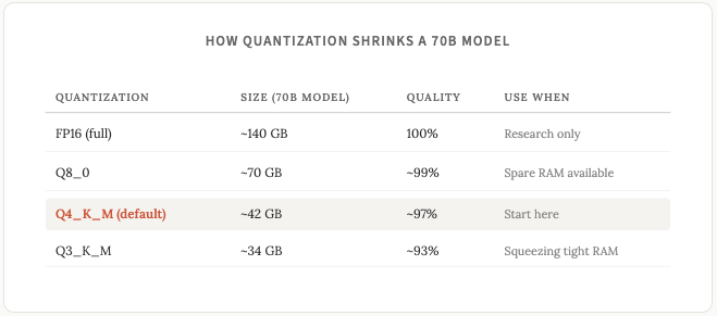 4-bit quantization produces output nearly indistinguishable from full precision for most tasks. If you come across models with names like Q4_K_M or Q3_K_M just know that these are referring to the same model just with 4-bit or 3-bit quantization.