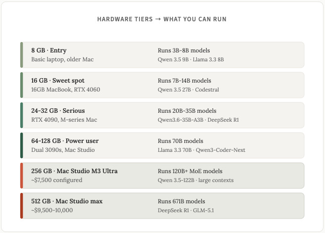 The quality curve is obviously real, and not all local models are created equal. Going from 8B to 14B is a noticeable jump. 14B to 32B is another. If you have the hardware for Kimi K2.6 or GLM-5.1 on a 512 GB Mac Studio, you’re running a model that beats Claude Opus 4.6 on SWE-Bench Pro. For normal hardware, Qwen3.6-35B-A3B on a 24-32 GB setup is the sweet spot in April 2026. You get near frontier quality on a standard machine.