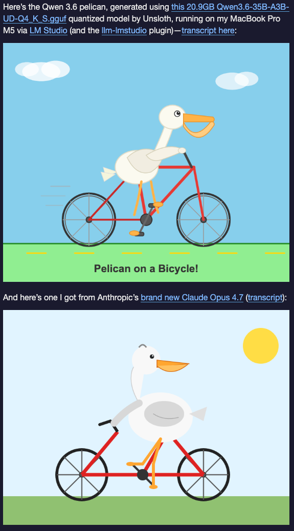 This is random but someone tested it on their laptop against Claude Opus 4.7 the day both were released, and the local model drew a better pelican riding a bicycle (very random and silly example but what’s life without a little whimy):