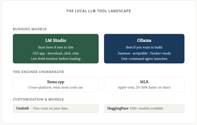 llama.cpp and MLX are the engines underneath. Both Ollama and LM Studio use one or the other for inference. Most people never need to think about them.