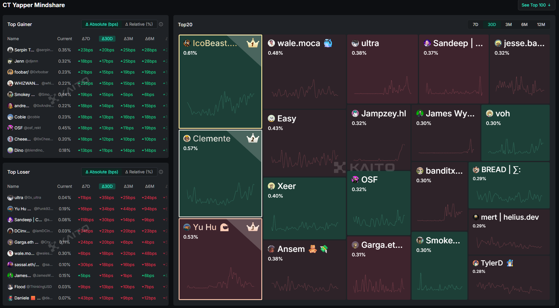 Kaito is basically a data analytics platform that tracks a bunch of stuff that hasn’t easily been able to track before, most notably social media sentiment and mindshare. How many people are talking about certain projects or tickers? Which accounts are getting the greatest engagement? Etc.