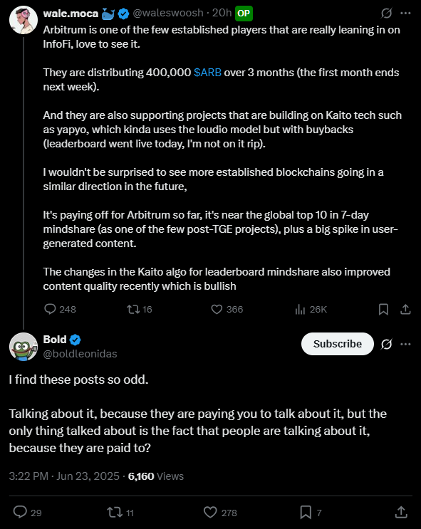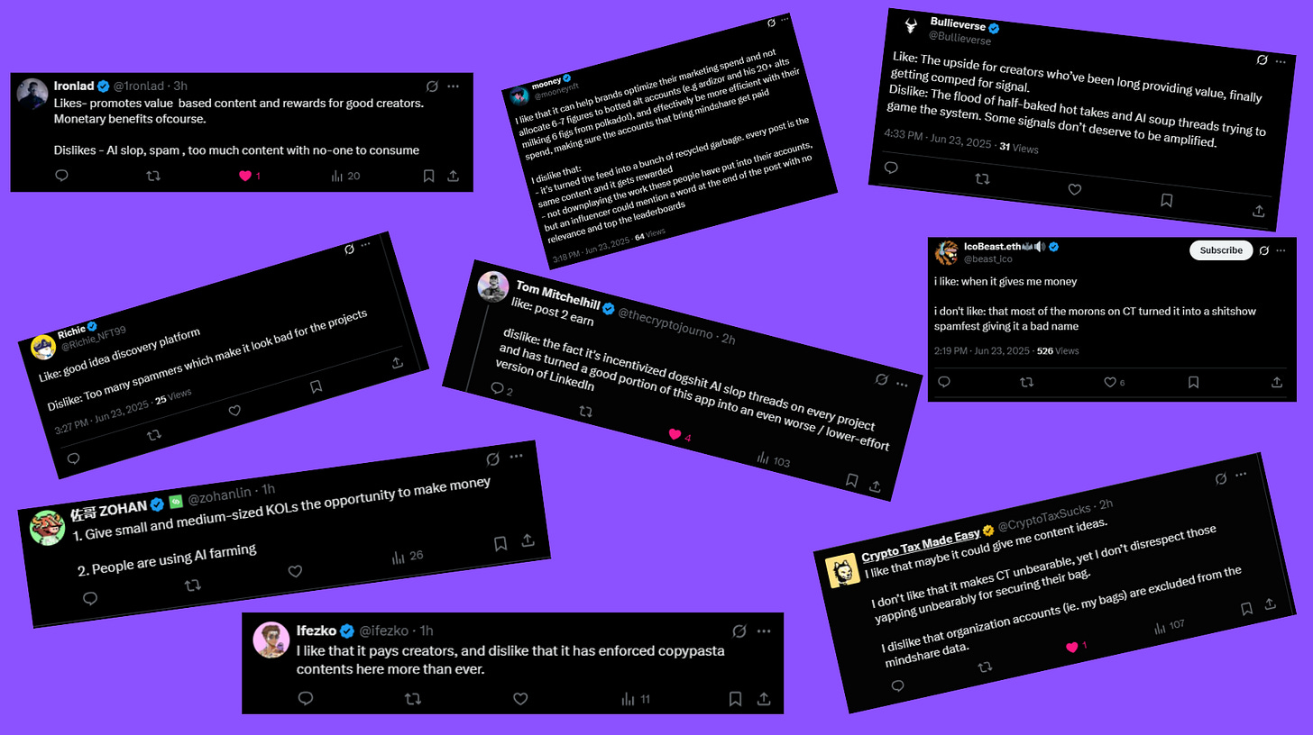 Initially it seemed like the community broadly enjoyed mindshare metrics, but lately there’s been a significant and noticable shift against the entirety of InfoFi. When you incentivize people to talk about projects, or to yap in general, you are going to get a lot of the same content spammed on the timeline. Literal stolen copy-paste posts, AI slop, low-effort garbage, engagement farming rage bait, etc etc.