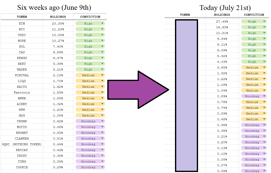 I’ll be doing this largely in real time, and so will be sharing my raw thoughts as I get to each token in my list, and then also the conclusions I come to about whether I want to continue to hold, to cut, to reduce my size, or perhaps increase it.