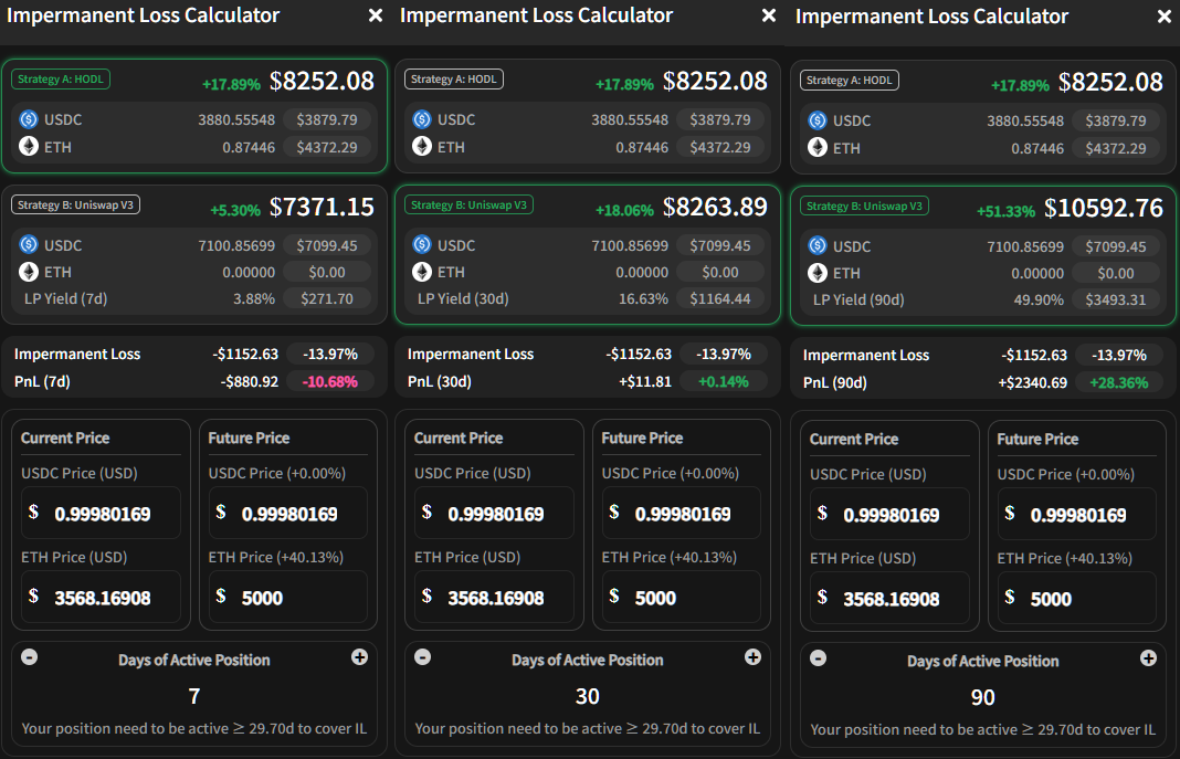 Actually, it’s a bit more complex than that — since you’re not necessarily comparing opening a liquidity position vs doing nothing. You ought to compare your liquidity position to whatever else you could be doing with the funds, aka earning 2-3% yield on your ETH or 5-15% yield on your USDC.