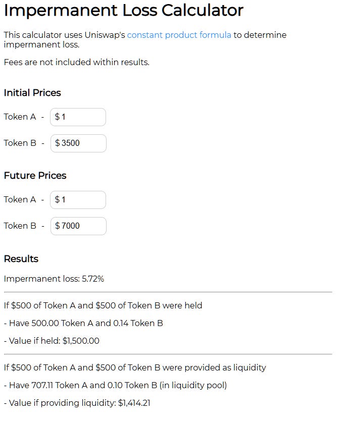 Once again, I prefer shortcuts, and have discovered another wonderful calculator which not only shows you your potential impermanent loss, but also the amount of fees you would need to earn in order to offset that loss.