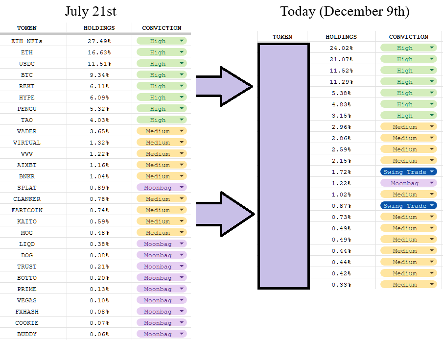 As you can see, I have fewer overall positions now. I still have a few too many holdings for my liking, but every time I do this process I find a few to cut out, and the goal is next year to be sitting on less than 10 total coins.