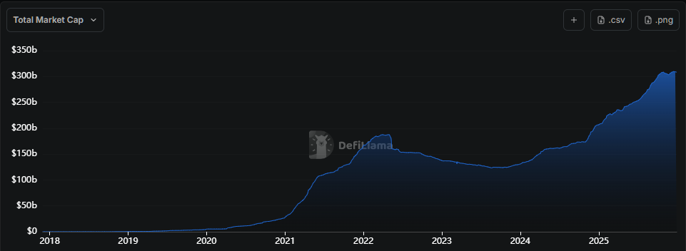 In 2025 we saw the total marke cap of stablecoins grow from ~$200b to ~$310b. I don’t see this trend slowing down and think we end the year over $500b, perhaps even over $600b.