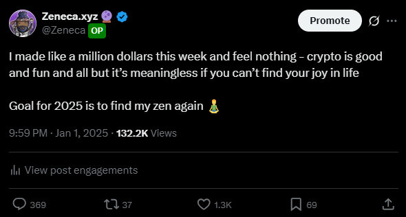 I wasn’t feeling happy at the time. I was numb and depressed and had no real idea why — but clearly having money or making money wasn’t doing much to help me out at the time.
