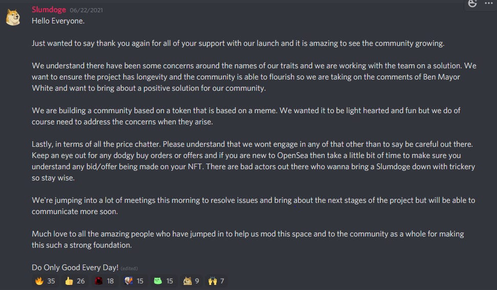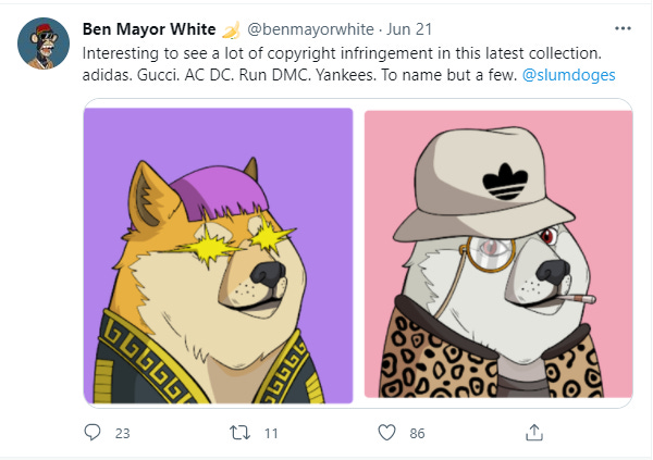 Oh yes you heard and saw this right. Was it not less than week ago that I was saying that it looked like NFTs were having a meme-coin esque movement? Well then it’s no surprise that the meme-iest of memes has found its way to the NFT world. They sold out 10k slumdoges at a price of 0.069 ETH ($134.55) a couple of days ago, and they were in the midst of the usual post-launch hype and hysteria when they got slammed with a serious case of potentially legitimate FUD. You see, the slumdoges used a lot of potentially copyrighted or trademarked images (don’t ask me for the difference, i’m no lawyer.. although actually I sorta kinda almost was.. but that’s another story for another day..). Anyway - some hours after the mint sold out @benmayorwhite tweeted this: