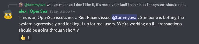 I’ve written briefly about Riot Racers before and explained them basically as Zed Racing but with cars and not horseys. I still think that’s more or less the best way to explain what they’re going for - albeit they are putting their own twist on things and doing it slightly differently. RR had their second ever drop on Monday night and it somehow went worse than their first drop, which itself was a disaster. I think it is fair to say that the issue almost entirely boils down to the fact that both drops were on OpenSea and there were OS related issues both times. The CTO of OS commented this on the second drop: