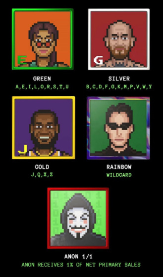 ANON is a scrabble-like NFT puzzle game, launching this month. Mint your Anon Tiles. Trade them. Collect them. Each week there will be timed riddles, you must have the right answer AND the right tiles to win. Prizes will be awarded to the winners.