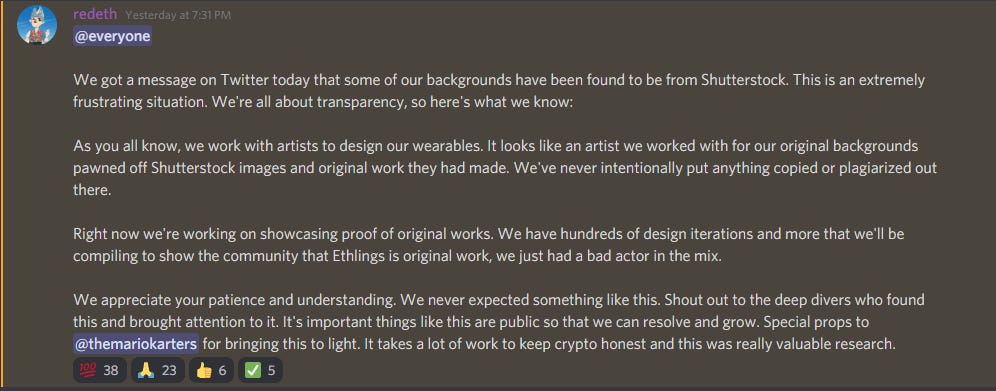 Well they’ve been chugging along nicely being one of the tortoises in this NFT avatar race, watching as the hares (cats, craniums, aliens, yetis) zoom past, while working hard at delivering value to their holders. I might do a full piece on them at a future point too, but for now I want to cover the news that came out today - it was discovered that the artist who designed the original backgrounds & borders for Ethlings stole images from Shutterstock and claimed them to be his own original work. Yikes.